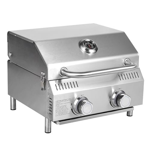 The Bestfire Tabletop Gas Grill offers 20,000 BTUs with two burners, ideal for camping and tailgating. Its stainless steel build and portable design make it a reliable choice for backyard gatherings. The Royal Gourmet PD1301S stands out with its 25,500 BTUs and three-burner setup.