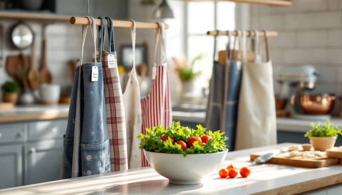 Kitchen aprons come in different fabric types. Cotton is soft and easy to clean. Polyester lasts longer and resists stains. Denim is tough and good for heavy work. Linen feels light but wrinkles fast.